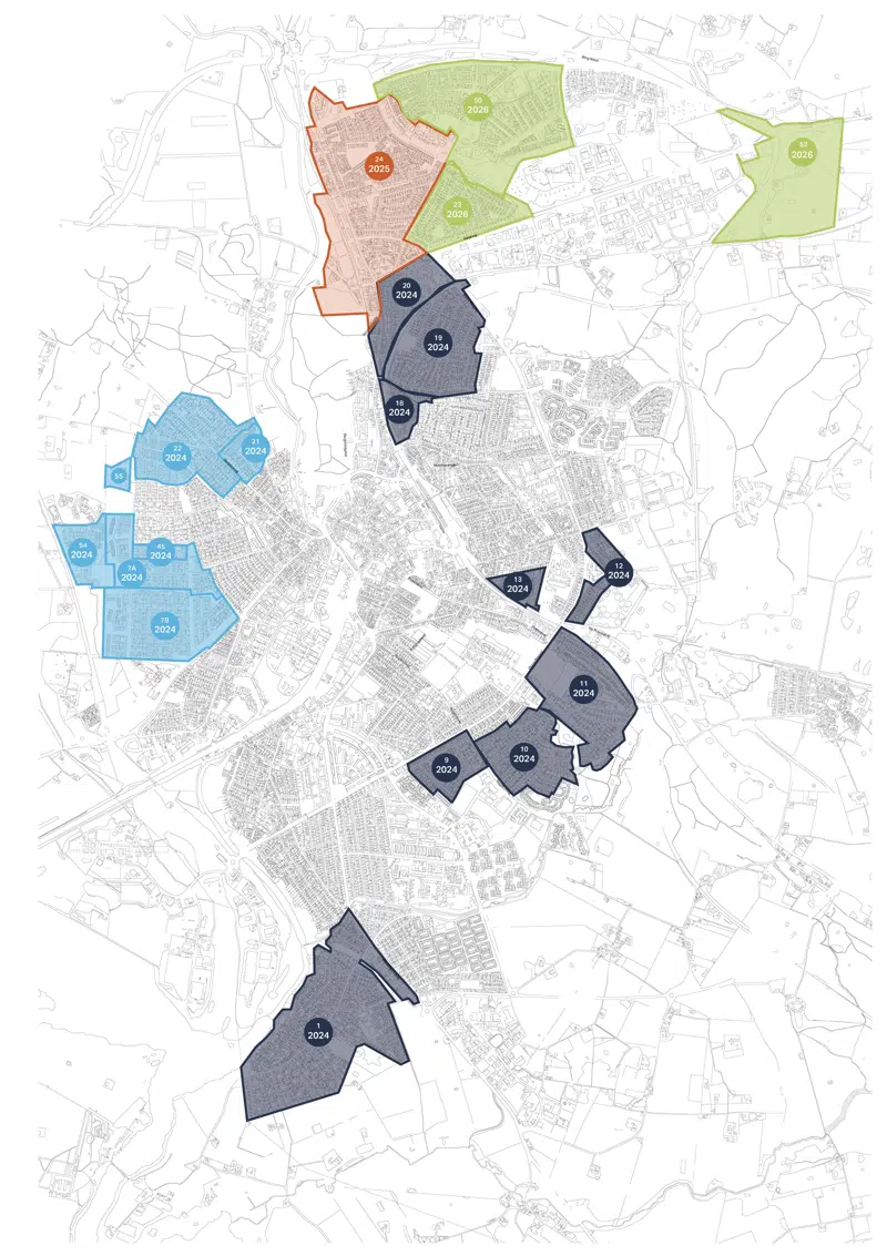 Mellem 2024 og 2028 tilbyder vi fjernvarme til 4.900 ejendomme i Næstved. Der skal være en tilslutning på 60% for at påbegynde projektet i de enkelte områder.