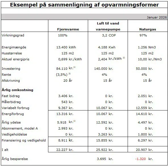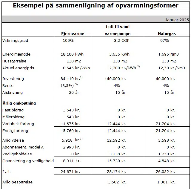Det skal præciseres, at ovenstående er et priseksempel ud fra nogle konkrete forhold. Man skal selv indhente konkrete data, tilbud mv. for sin egen ejendom, for at skabe et beslutningsgrundlag for valg af varmekilde. Beregningen kan alene bruges som eksempel og gøre opmærksom på de elementer, der bør indgå i den økonomiske beregning for de enkelte varmekilder.
