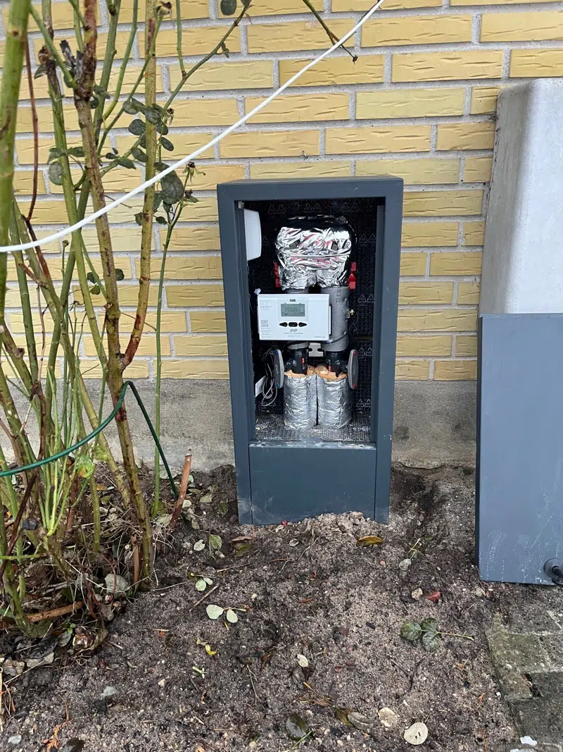 Det udvendige fjernvarmeskab bygges udenpå fjernvarmerørene, der hvor de går ind i huset, for at passe på og beskytte dem. Det er også her måleren til fjernvarmen sidder i nyere installationer.