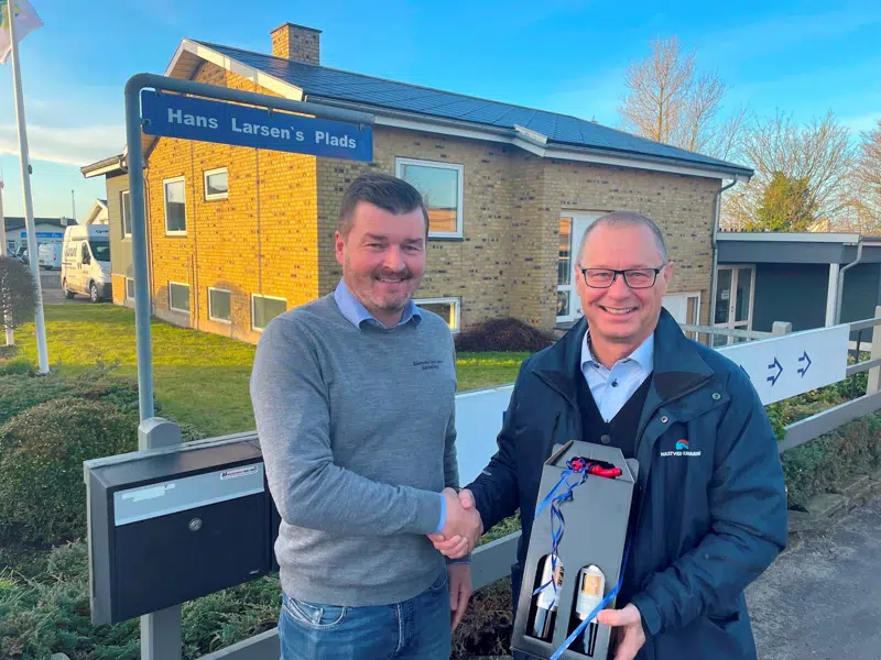 På billederne ses formand Kristoffer Petersen og direktør Jens Andersen (th.) overrækker kunde nr. 7.000, Malermester Morten Larsen (tv.) 2 flasker vin.