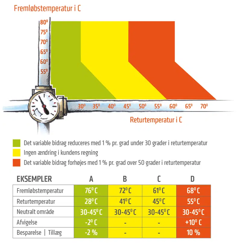 - Kunden får 1 % i besparelse af det variable bidrag for hver grad, returtemperaturen er under 30 grader.