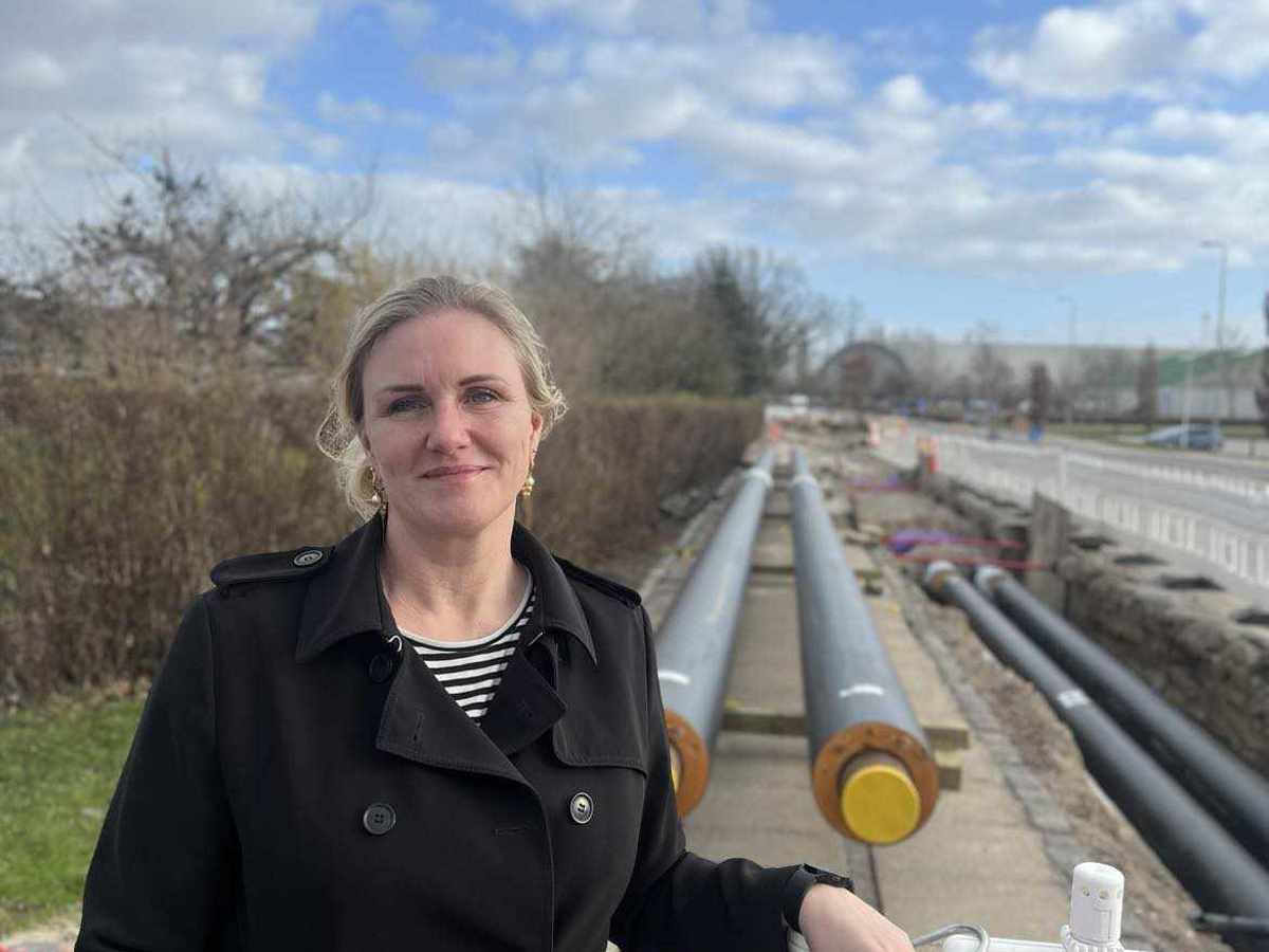 Ude foran Margit Orebys hus bliver der lige nu anlagt en ny fjernvarmeledning til DSB-værkstedet og hun glæder sig over at der nu kommer fjernvarme til hendes hus.