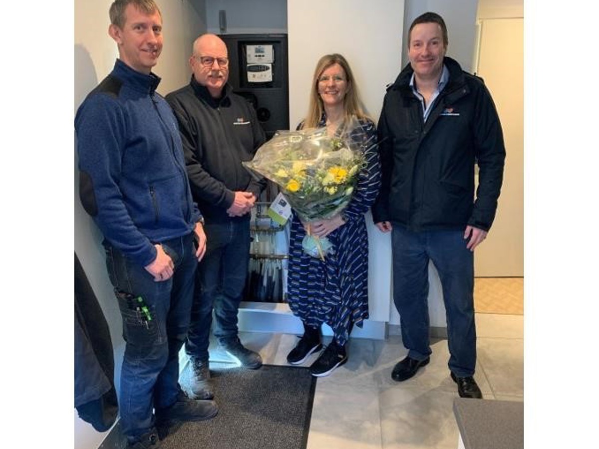 I den anledning har servicetekniker Jakob Søndergaard, energimontør Lars-Ole Reesenholt og kundechef Arne Ulstrup været forbi med et par flasker vin og en buket blomster til en glad husejer Birgitte.