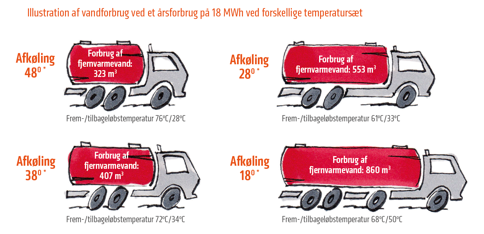 Afkølingen er som regel størst og returtemperaturen laves om vinteren, hvor alle har brug for varme. Omvendt er afkølingen lavere og returtemperaturen højere om sommeren, hvor vi næsten kun bruger fjernvarmen til at få et varmt bad.