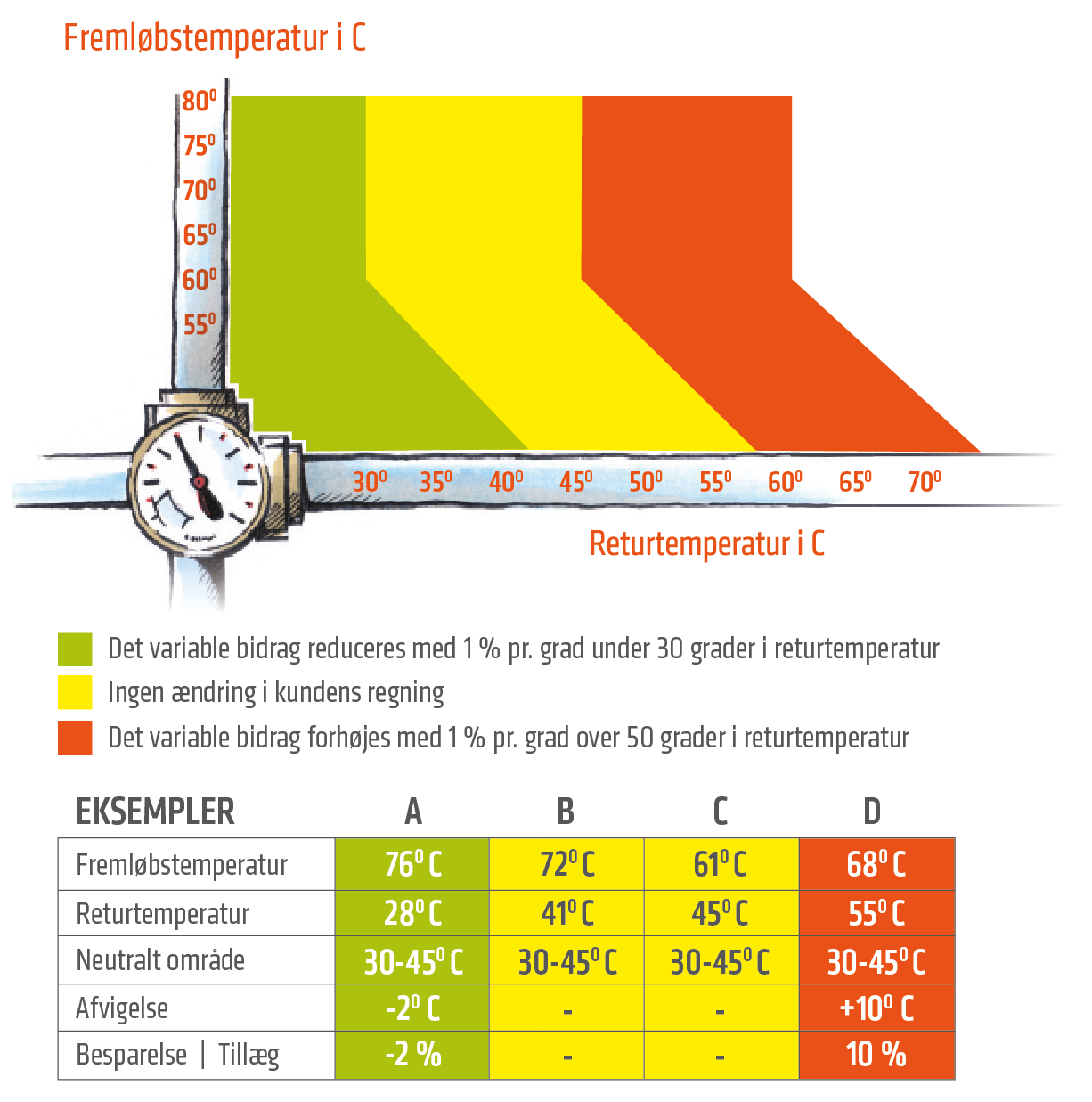 - Kunden får 1 % i besparelse af det variable bidrag for hver grad, returtemperaturen er under 30 grader.